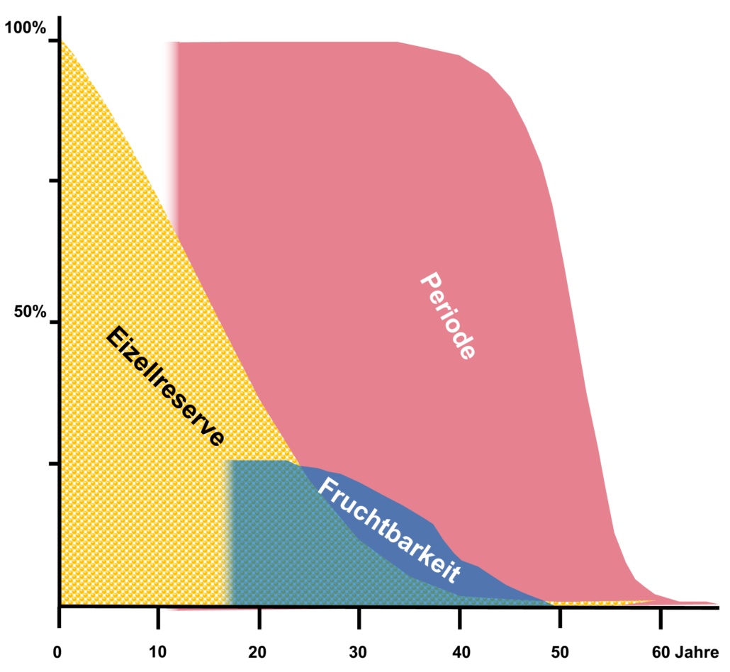 Bereits als Baby kommen die kleinen Mädchen mit einem festgelegten Vorrat an Eizellen auf die Welt. Eizellen können nicht nachwachsen. Ab der Pubertät sorgt die Ausreifung von Eizellen für Hormonproduktion und Menstruationszyklus. Ist der Vorrat an Eizellen erschöpft, endet der Zyklus (Menopause). Die Fruchtbarkeit ist hier dargestellt als die Wahrscheinlichkeit, in einem Monat schwanger zu werden. Sie sinkt bereits ab dem 35. Lebensjahr und geht schon vor dem Ende der Periodenblutungen verloren.