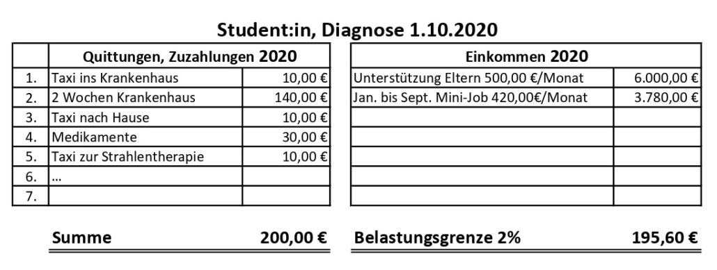 • Mit einem Zuzahlungsrechner (über Suchmaschine im Netz suchen) die Belastungsgrenze kalkulieren